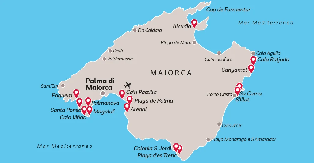 La più grande dell’arcipelago, Maiorca attira da sempre viaggiatori ed artisti per la sua ricchezza e varietà. Storia, arte, cultura, divertimento sfrenato, paesini sperduti e pittoreschi, mare e montagna racchiusi in un’unica isola, la trasformano nella meta perfetta per ogni tipo di vacanza.